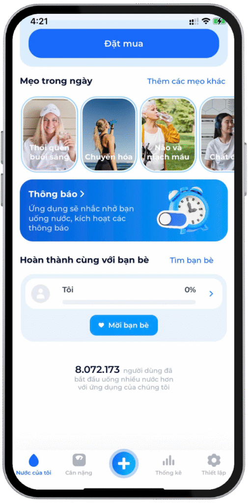 "Nước của tôi" giúp bạn uống nước một cách đều đặn. Tính toán lượng nước hàng ngày cho bạn và nhận những thông báo!